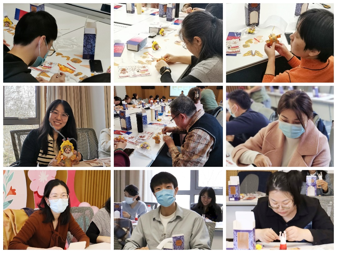 活动伊始,教职工们全员动手一起来,认真按照图示指导,耐心地取出一件件精巧的原材料,借助胶水、剪刀等工具,细致地为手中的石膏娃娃穿戴衣冠,佩戴头饰,粘贴配饰,全程不亦乐乎。