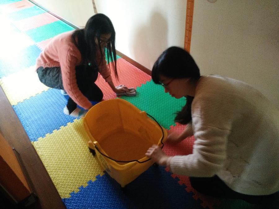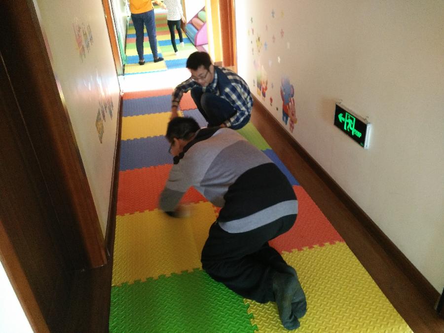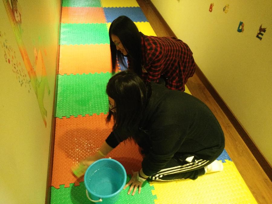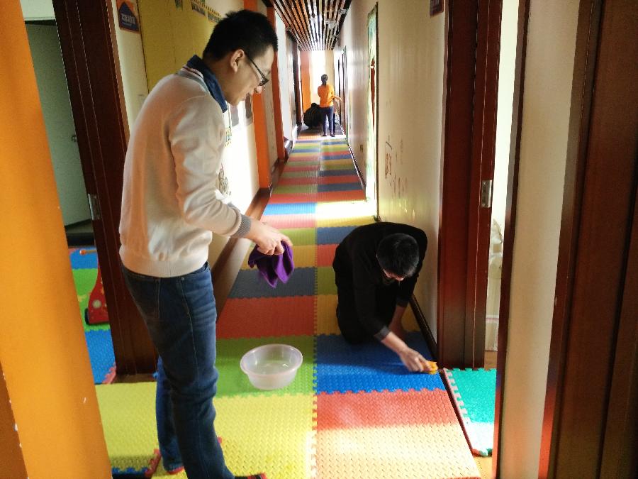 在与孩子和家长短暂告别后,党员们进行了第二项志愿服务――打扫卫生。为了方便脑瘫儿童进行康复训练,康复中心的地面铺满了泡沫地垫,于是党员们承担了清洁第二楼层和第三楼层泡沫地垫的工作。党员们两人一组,一人负责拿着刷子清洁地板,另一人则负责用抹布擦干地面,这个过程虽然需要一直半蹲着弯腰进行,但党员们均毫无怨言,纷纷热情高涨地完成了清洁工作。