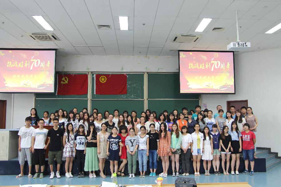 活动包含:奏唱国歌、默哀先烈、重温入党誓词、重温入团誓词、集体宣誓等环节。庄严的国歌将同学们带入了抗日战争那段血泪史;同学们用默哀向无辜的死难者和为国捐躯的中国军人致敬。分团委书记高敏丽带领大家宣誓。一句句铿锵有力的誓词表达了同学们对党组织和团组织的决心和信心,也寄托了党团组织对青年学子的殷切期望。“铭记历史、缅怀先烈、珍爱和平、开创未来”青年大学生们以集体宣誓的方式纪念反法西斯战争暨中国抗战胜利70周年。