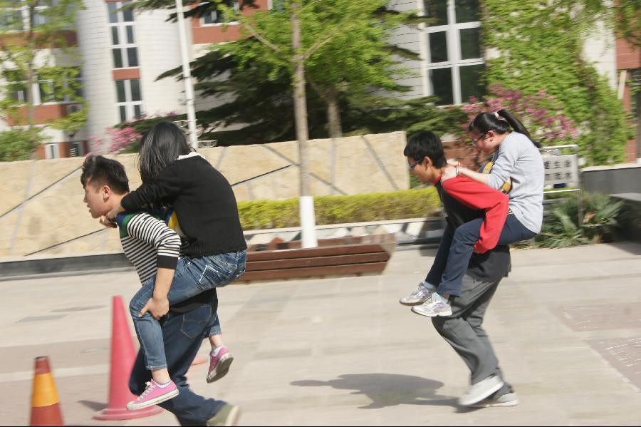 在这个比赛中,男生们都纷纷选择了班里较为娇小的女生,围观的同学也向参赛选手投来了期待的目光。预备阶段各班的两名选手先进行了尝试,男生背女生夹球跑,背靠背夹球向前跑等。最后每组同学都选择了背的方式。随着裁判员的一声令下,男生们奋勇地背起女生向终点冲去,同学们的欢呼声也随之越喊越大,比赛进行得无比激烈。