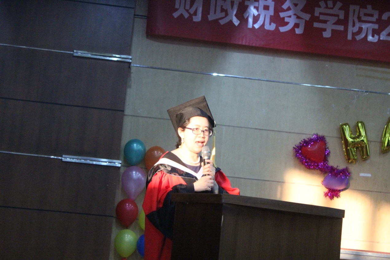 随后,研究生校外导师代表、北京资产评估协会二部主任毛群,校内导师代表赵琼副教授依次登台送出寄语。毛群首先祝贺同学们顺利毕业取得学位,她结合自己的工作分析了资产评估行业现在的状况和发展前景,希望各位毕业生踏上工作岗位后能利用自己的专业知识不断开拓工作新思路、创新工作新方法,为行业注入新的活力,及早成为行业精英。