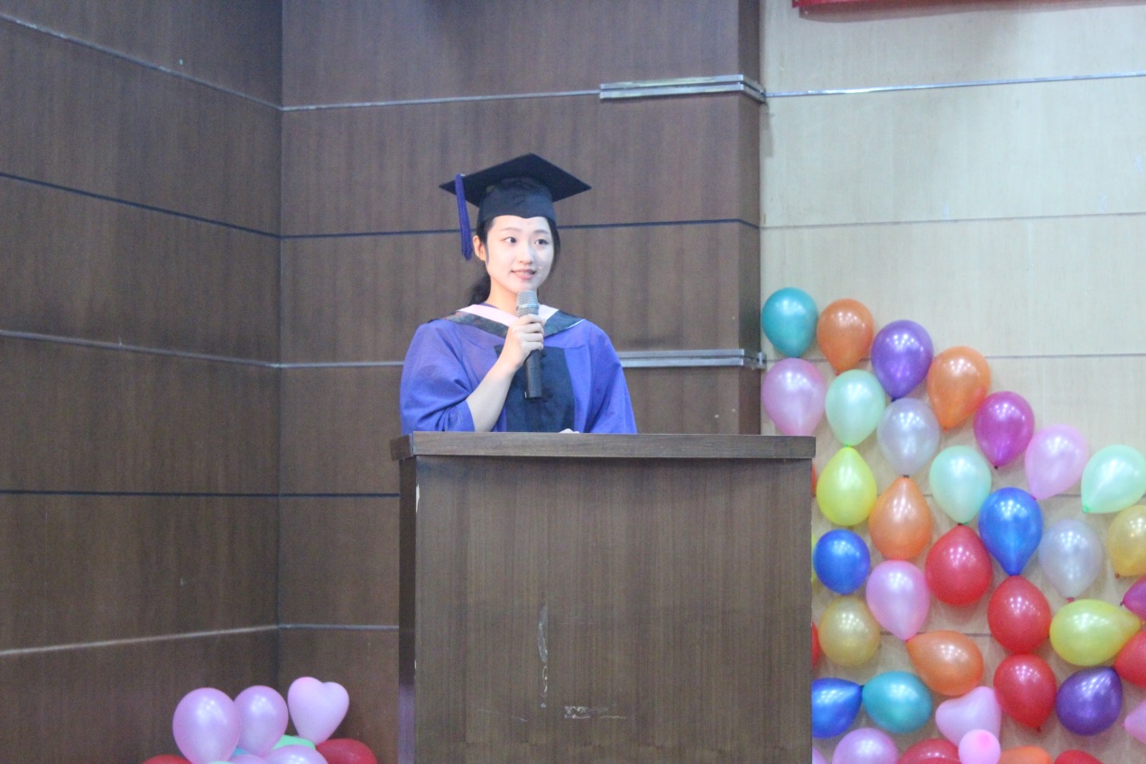 接下来,毕业生代表常怡娜代表全体毕业生发言,感谢母校的培养和老师们的教导,感谢家人的支持,感谢同学们的陪伴。常怡娜说,在即将离开校园,踏上人生第一个工作岗位时,大家需要明确两点:一是不忘初心,牢记使命。迈进新时代,作为青年俊杰也被赋予了新使命。如何紧紧追随社会发展大潮,是每位同学做出新选择、开启新征程、肩负新使命的大前提。希望同学们能够有所思考,载着母校的期盼在新岗位上成长成熟,早日成为行业内的中流砥柱,用激情与活力、智慧与创意,担当起推动社会发展的使命,做到“经世济民”。二是崇尚德行,创新实践。同学们将带着过去这几年里塑造的优良品格、锻炼出的过硬本领、收获到的宝贵学识,踏上新的人生征程。向母校保证将会用一生去诠释“崇德尚能、经世济民”的校训,用行动和奋斗书写无愧于新时代、无愧于经贸人、财税人的华彩篇章。最后,她以梁启超先生的一句话与大家共勉——“纵有千古,横有八荒。前途似海,来日方长。”
