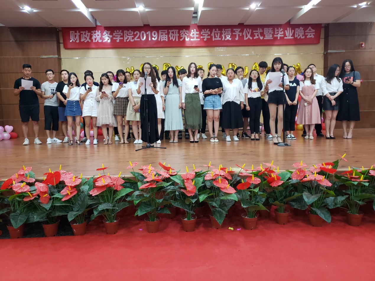 随后,在校生代表谢浩然代表全院在校师生发言,祝贺师兄师姐们即将踏上新的征程,开启人生新的篇章!感谢师兄师姐们在考研最艰难的时候,传授经验、加油打气——初入校园的时候,忙前忙后、答疑解惑;选课和开题焦头烂额的时候,思虑考量、指点迷津。无论师兄师姐走向何方,都将伴随母校和学院的真诚祝福,携带着恩师的殷殷期盼。请师哥师姐记得常回家看看,这里有尊敬的师长及挚爱你们的学弟学妹们。低眉处无奈流年似水,扬帆行有志风华如火。他衷心祝愿毕业的师哥师姐们能够带着财税人的才华和精神,早日实现属于自己的人生理想,前程似锦,扬帆远航!