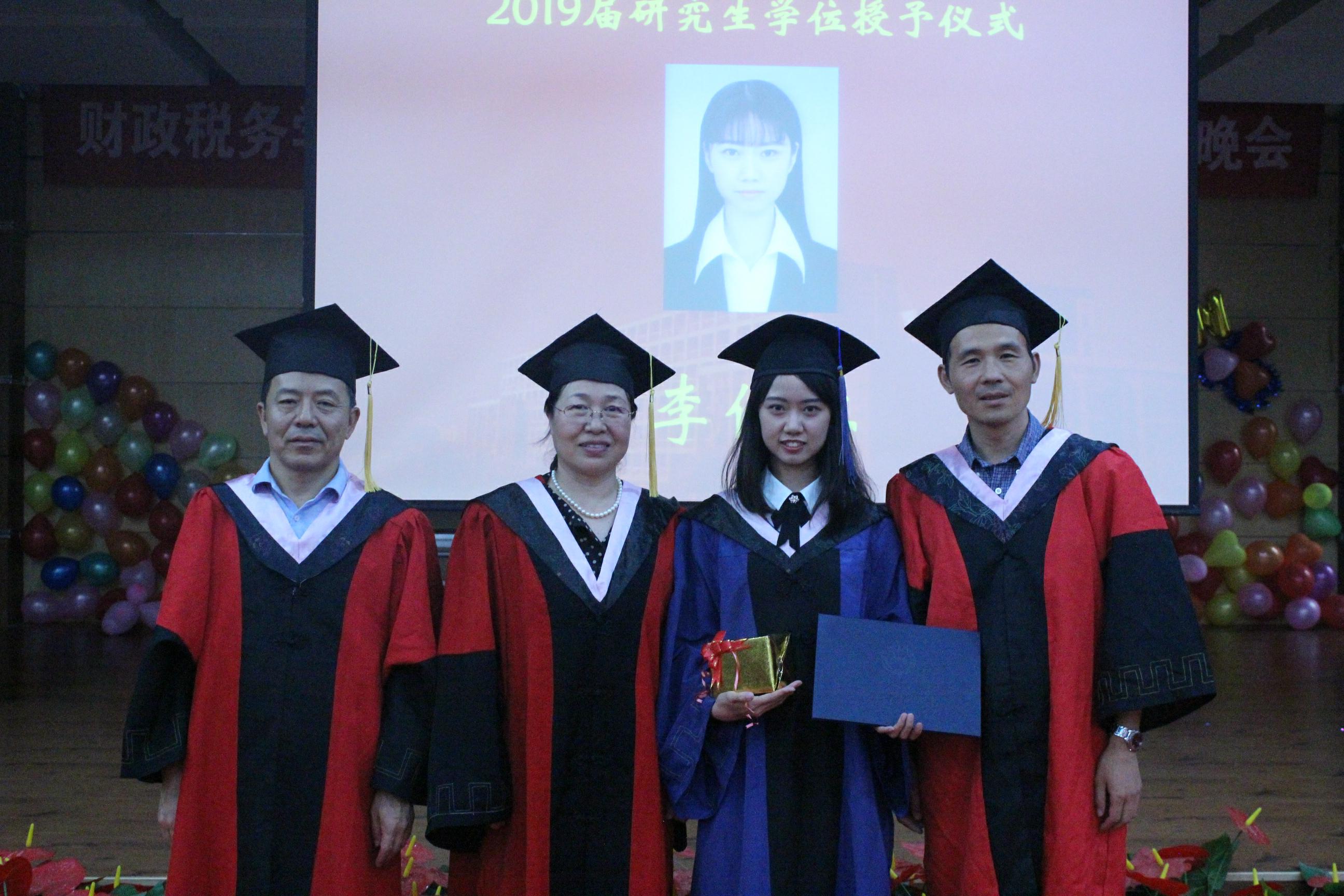 在学院领导、导师代表、毕业生代表、在校生代表发言结束后,进入研究生学位授予仪式。学院院长李红霞老师、学院党委书记刘学伟老师和导师一起上台,为每一位毕业生授予学位并送上学院精心准备的毕业礼物。