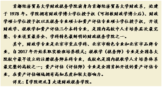 财政学专业是北京市重点学科、北京市特色专业和北京市品牌专业,自2017年开始采取实验班培养模式;税收学(税务师)专业是全国最早开设注册税务师方向的本科专业,在全国首批设立税务专业硕士学位授予点;资产评估专业是北京市首家开设的资产评估本科专业,也是全国最早开设注册资产评估师方向的本科专业,在全国首批设立资产评估专业硕士学位授予点。