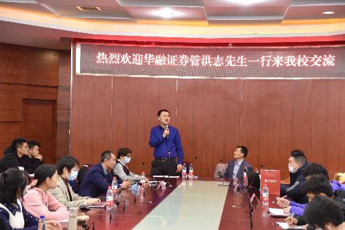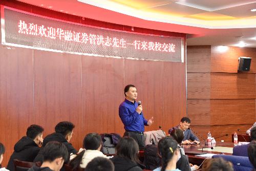12月3日晚,草莓视频 邀请华融证券管总一行来我校交流。此次交流活动由华融证券管总、潘女士、孙总主讲,华融证券金总、赵先生、翟先生等嘉宾、草莓视频 副院长王竞达、评估系教师王田力、分团委书记吴瑛楠、以及本科和研究生约140余人参加了本次讲座。