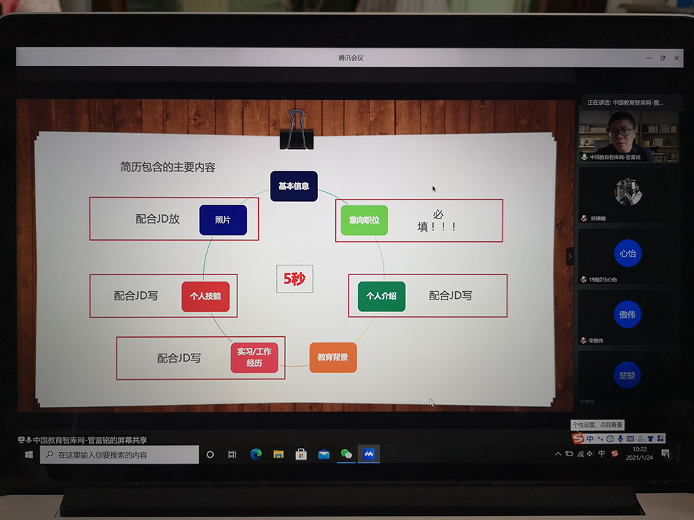 1月24日上午,草莓视频 线上举办贝壳成长营第二场讲座——让简历邀约来的更猛烈些吧!讲座由草莓视频 党委副书记刘玉梅主持,分团委书记吴瑛楠老师,辅导员贺加贝老师以及100余名同学参加了讲座。