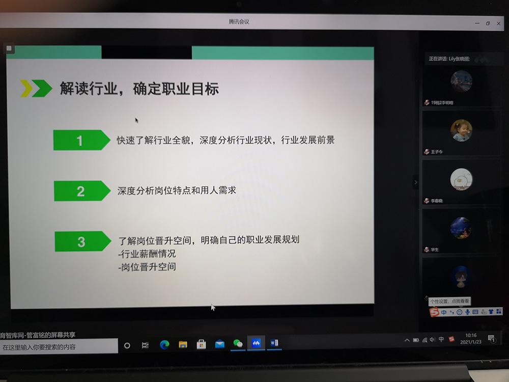 1月23日,草莓视频 贝壳成长营就业辅导系列活动如期而至,本期活动的第一场讲座是由中国国际金融股份有限公司招聘负责人张晓丽带来的“职业规划精准定位,敲开名企之门”。张晓丽曾任宝洁、普华永道、汇丰银行等知名企业招聘经理,有着丰富的人力资源管理和职业生涯规划经验。讲座采用腾讯会议线上进行,草莓视频 党委副书记刘玉梅、分团委书记吴瑛楠、辅导员贺加贝以及100余名同学参加此次讲座。