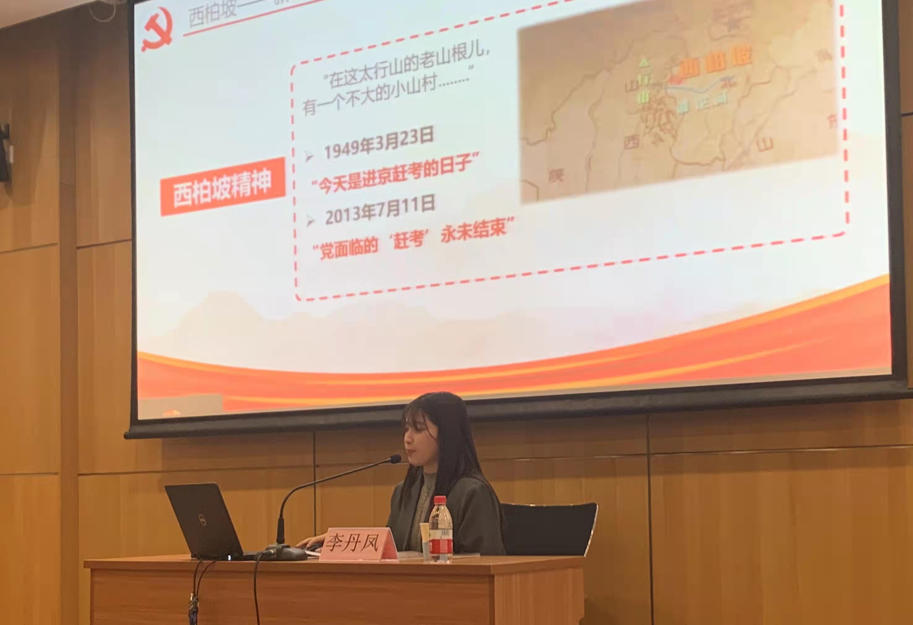 李丹凤同学首先从“赶考”二字——我们不断地在面临各种“考试”,引出我们党的赶考之路:从南湖红船出发,我们党走向井冈山,走向延安,走向西柏坡......西柏坡精神同红船精神、井冈山精神和延安精神等一同伴随着中国革命的光辉历程,共同构成了我们党在前进道路上战胜各种困难风险、不断夺取新胜利的强大精神力量和宝贵精神财富!