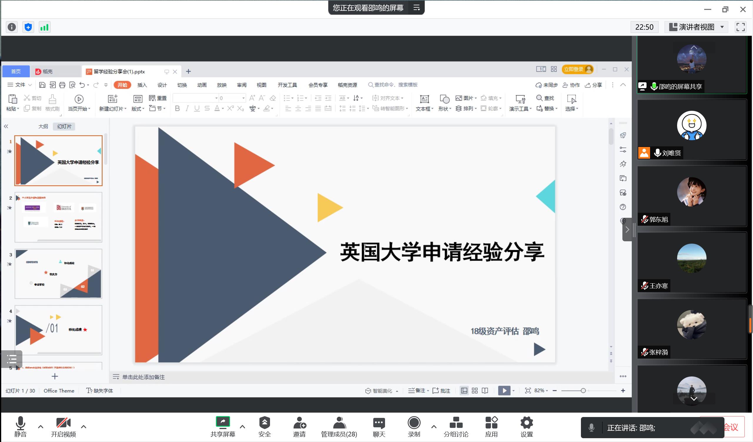 邵鸣以“英国大学申请经验分享”为主题,为留学应当如何选择学校和专业给予对策和建议,并就备战语言标化考试为在场的同学们提供经验指导;同时,她还建议同学们应当以专业实习和学科竞赛为主要途径,提升自身的软实力,进而增强自己的综合竞争力;此外,邵鸣详细地介绍了与留学相关的诸多重要事项,如是否需要选择留学中介、如何获得学校往年的录取数据、如何写一份优秀的文书、留学申请的时间分布以及语言成绩与留学申请的关系等。