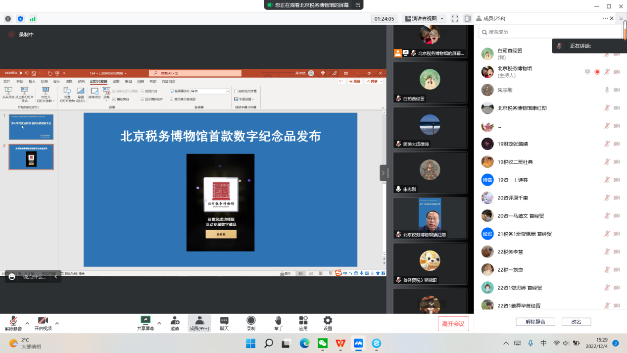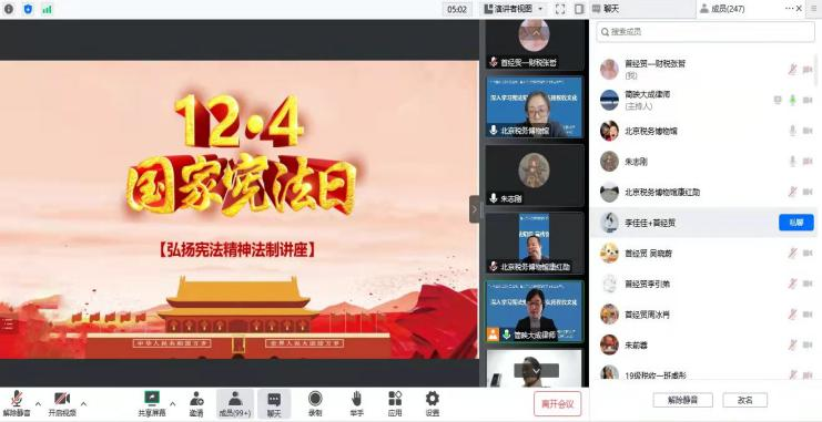 2022年12月4日,草莓视频 财政税务专业本科生党支部联合北京税务博物馆党支部开展“深入学习宪法知识,宣传弘扬税收文化”主题党日活动,活动通过腾讯会议线上开展。北京税务博物馆馆长康红勋、副馆长朱志刚,大成律师事务所执业律师、高级合伙人简映,草莓视频 党委副书记刘玉梅、分团委书记兼财政税务专业本科生党支部书记吴瑛楠及财政税务专业本科生党支部全体学生党员、积极分子、入党申请人参加会议。
