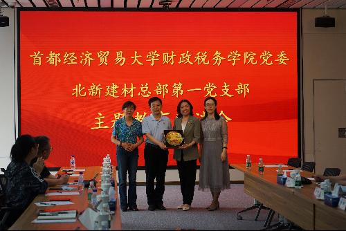 参观结束后,双方围绕高质量党建引领高质量事业发展进行了座谈。北新集团建材股份有限公司党委副书记张静详细介绍了在国资委的领导下北新集团建材股份有限公司的发展历程、“一体两翼、全球布局”的发展战略和公司全面加强党的领导,践行新发展理念、实现高质量发展所取得的成绩。学院党委书记刘学伟、副书记刘玉梅、党委委员王竞达在座谈中表示:北新集团建材股份有限公司切实发挥党建引领作用,深入推进党建和业务深度融合,实现公司快速优质发展的做法非常值得借鉴和学习,公司创新党建工作新模式,运用数字化媒体开展丰富多彩的党建活动的做法走出了一条内强素质、外树形象、打造品牌、全面发展的党建引领企业高质量发展的特色之路。座谈会上,双方还就加强党的建设、人才培养、学生就业等方面进行了深入交流。双方一致表示,希望以此次活动为契机,进一步加强交流、经验互享,以党建增进了解、以党建凝聚共识,努力探索“党建+校企合作”新模式,共同打造党建联建共建新范式。座谈会结束后,学院党委书记刘学伟、党委委员王竞达代表学院向北新集团建材股份有限公司赠送了纪念礼物并合影留念。