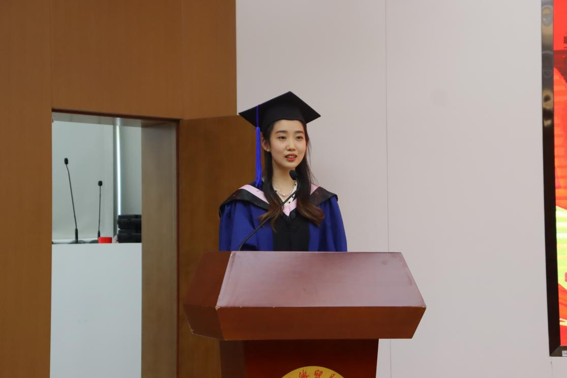 2023届硕士研究生代表魏卓凡感慨道:一路走来,是学校的良好生活环境与严谨的科研氛围为学子们保驾护航,是每一位导师夜以继日的谆谆教诲为学子们指引前进的方向,是社会的关心爱护让学子们有了肩负责任继续向前的不竭动力。在踏往新征程的道路上,将不断开创思路,把握人生的主旋律,做肩负起时代重任的首经贸人,与母校共同进步,与祖国同向同行。
