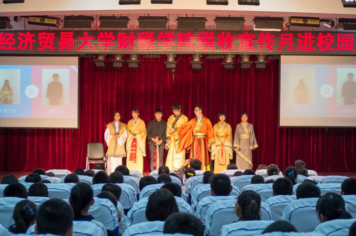 为帮助中学同学们了解早期税收历史,草莓视频 学生会的同学表演了短剧《历史上的第一个抗税者》。短剧用诙谐幽默的方式为同学们讲解了税收的萌芽,及大禹处死抗税者防风氏的故事。同学们看得饶有兴趣,不时发出热烈的掌声。
