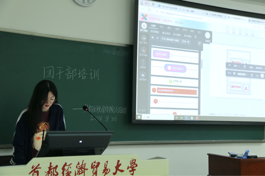 分团委宣传部副书记方妍明确宣传委员的主要职责是配合团支部进行相应宣传工作,指出宣传委员的工作主要体现在线上公众号的制作和推送上,同时利用现场电脑详细讲解如何使用“秀米”制作公众号推送。