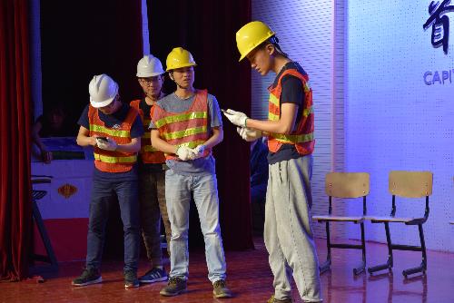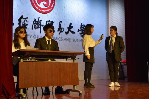 最后出场的2015级税收卓越班以新闻联播的方式联系了一带一路政策下哈萨克斯坦的群众生活,手表出口,沙漠种菜,北京的残疾人咖啡店等小故事,表现了税收制度对中小型企业和高新技术产业的照顾与扶持,帮助平衡产业,踏踏实实迈进促进经济发展每一个脚步。