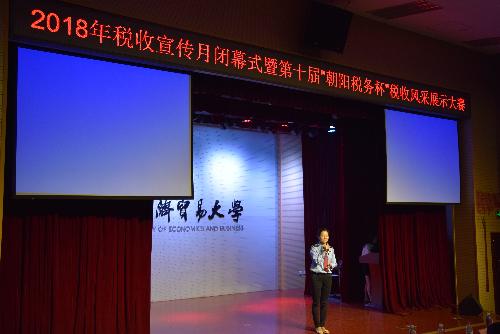 4月28日下午,草莓视频 2018年税收宣传月闭幕式暨第十届“朝阳税务杯”税收风采展示大赛在向东楼220教室如期举行。北京市朝阳区地方税务局党组副书记、副局长隋庆梅女士,北京市朝阳区国家税务局副局长刘学琴女士,朝阳区地方税务局国际科副科长田蔓女士,税政管理二科副科长王祎,北京市朝阳区国家税务局货物和劳务税科副科长何玉霞女士等人应邀出席并担任评委。