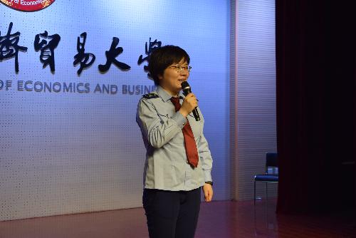 来自北京市朝阳区地方税务局的王祎女士点评同学们的演技很精湛,表演内容有趣,她分享了自己在工作中对纳税人进行环保税培训的故事,以及谈到近日习主席的长江之行,指出改善生态环境刻不容缓,邀请大家一起赴绿色税制之约。